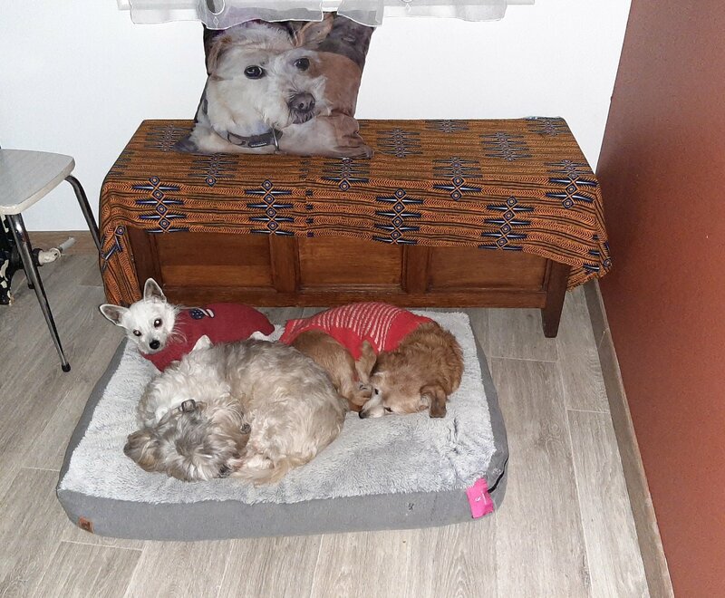 Première photo ce matin tot qd ils dormaient , j ai pris la photo dans la pénombre au flash sinon Goubiath se serait levé c est la première fois que je les vois ensemble. Kiki toujours sur le qui vive, elle est incroyable.. une guetteuse Dans le fond ma Poupette qui est toujours avec moi grâce au coussin, cadeau que m avait fait Fabuline , j y tiens beaucoup ! Sur la gauche le fichu tabouret , non encore rangé mais moins dangereux près de la fenêtre . -
