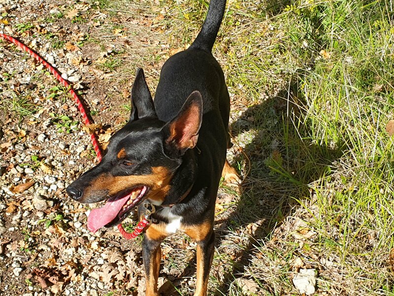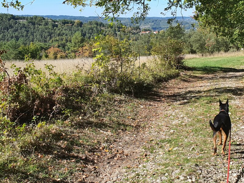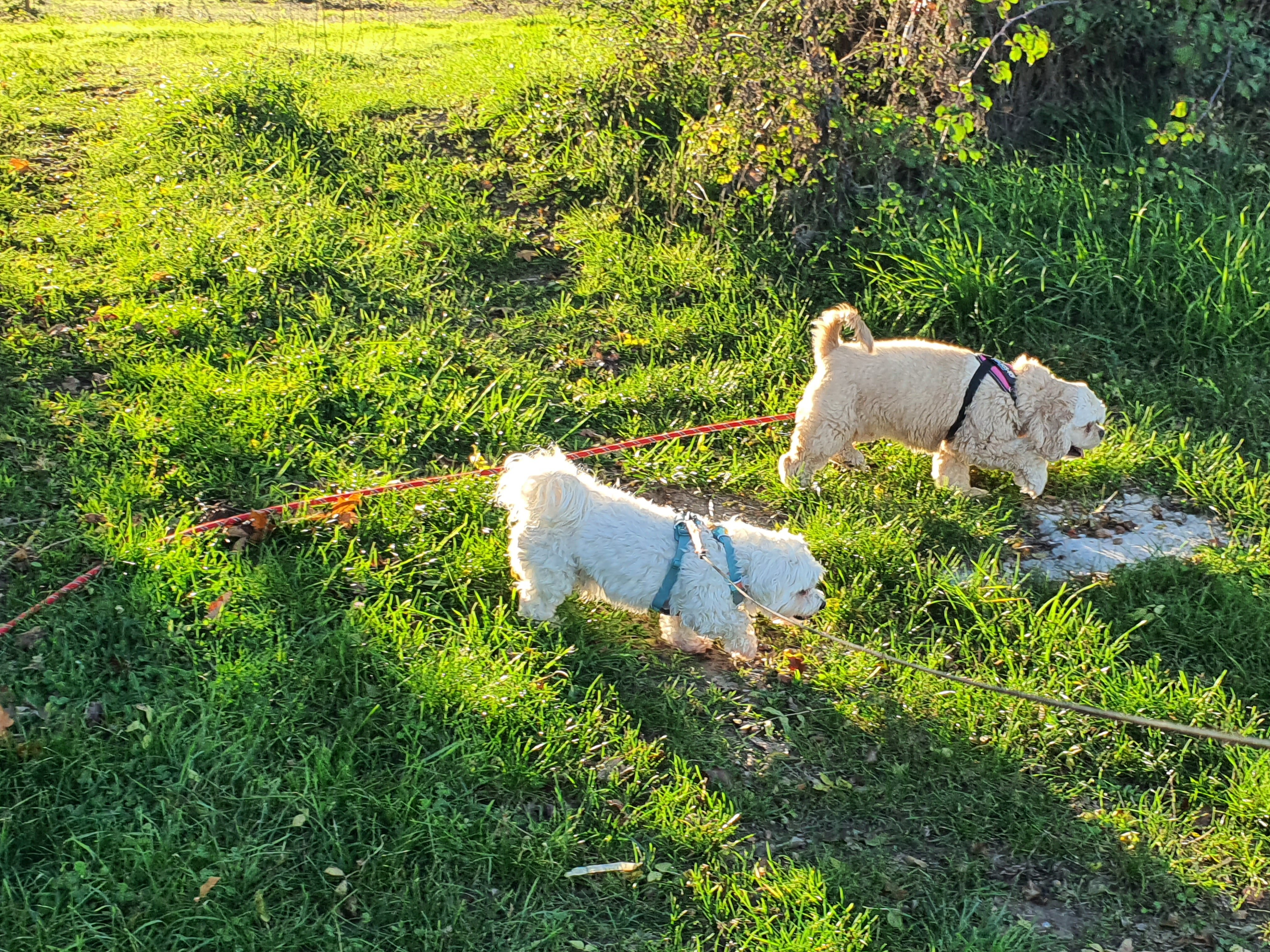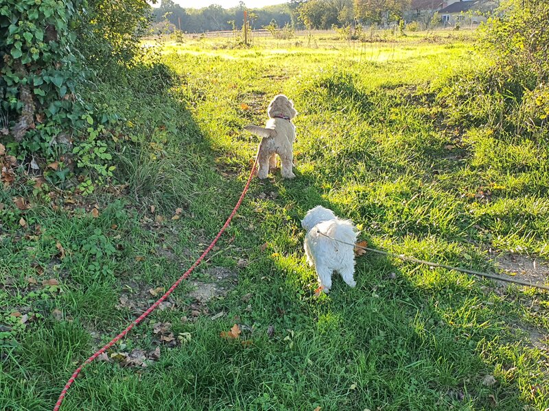 2. Petites photos de la balade des loulous, prises hier Sur les 2 premières photos, Max; (il faisait chaud, il tirait la langue) Sur les 2 dernières: Agathe et Rouxy. J'attache la longe d'Agathe à la ceinte et Rouxy est avec une laisse enrouleur Je rajoute celle de Rouxy avec son popa, mise dans le post du jour