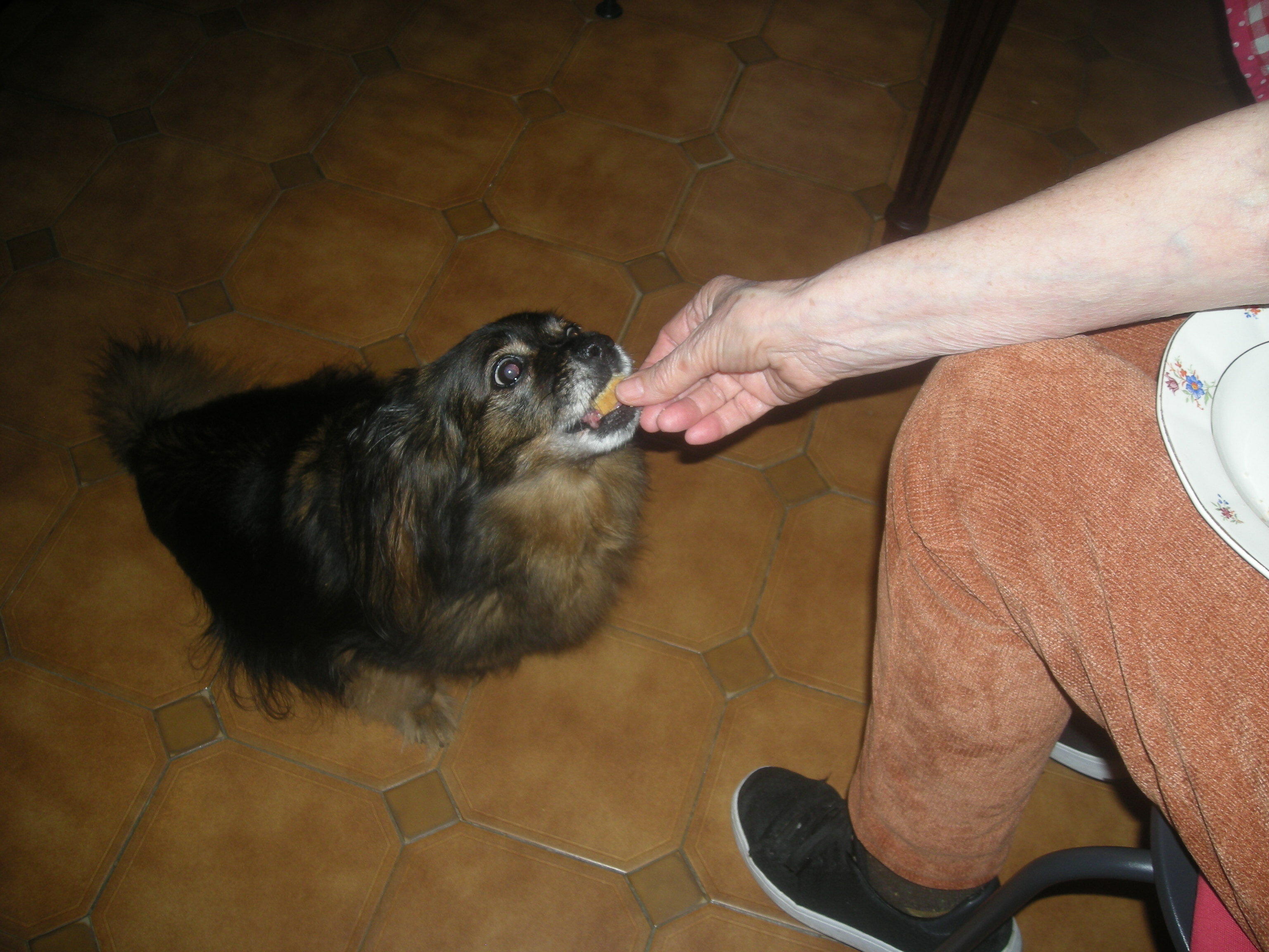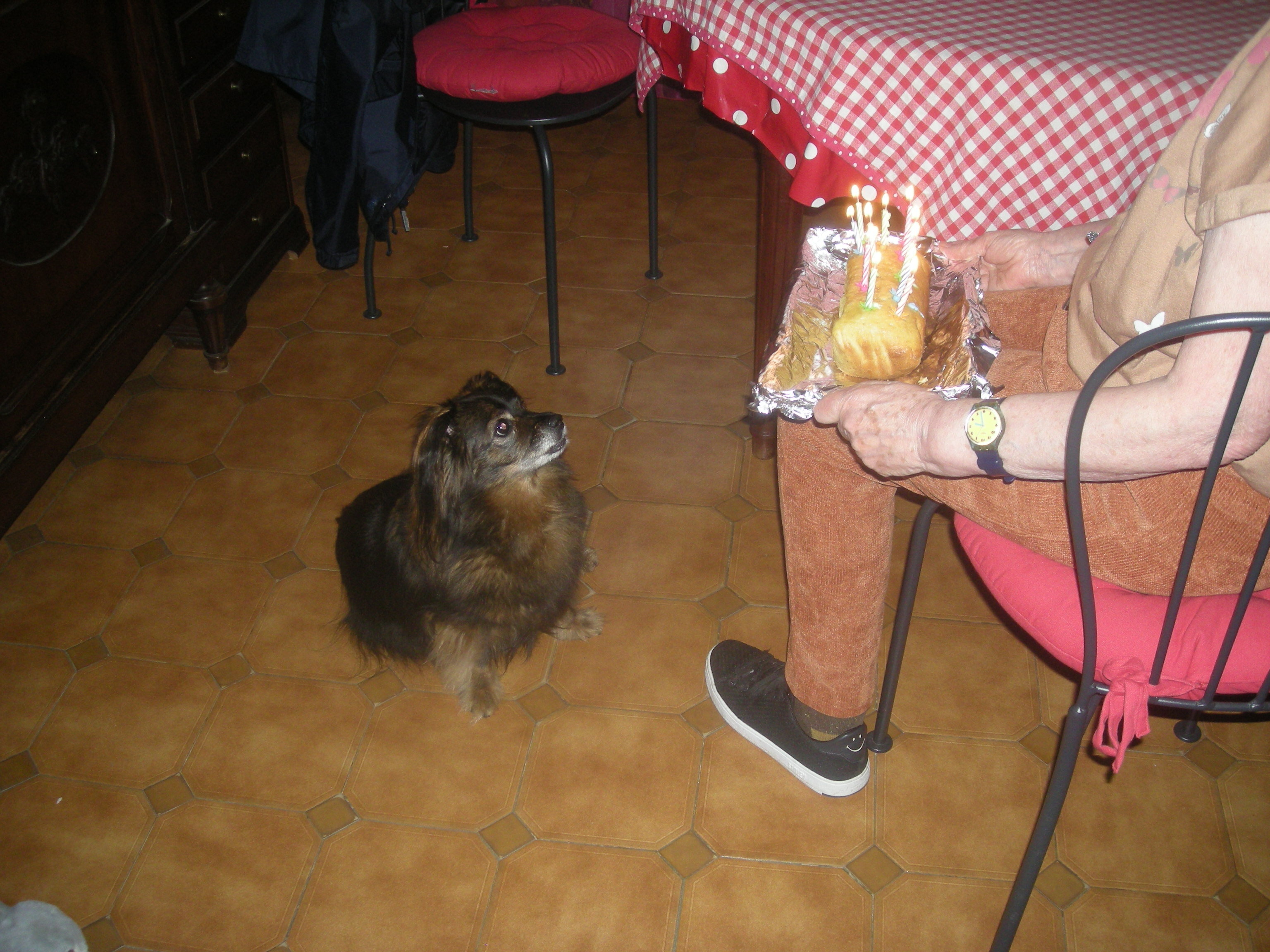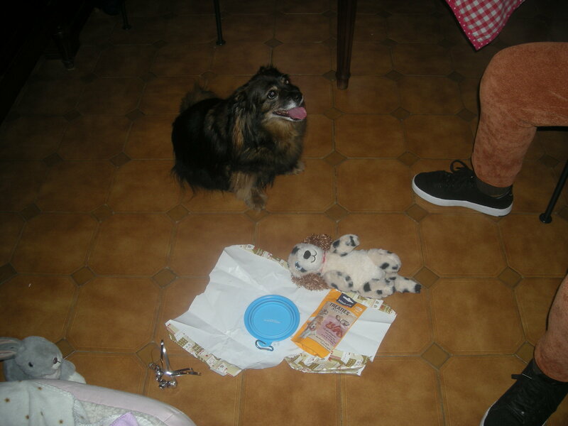 Bonjour à Tous, C'est moi CHA CHA et je viens vous dire que samedi c'était mon anniversaire j'ai 11 ans. Nous avons fait une petite fête et j'ai été très gâtée. Je vous montre : Sur la première photo Moman me montre mon gâteau avec 11 bougies... Il a l'air bon ! Sur la deuxième photo, dégustation. Sur la dernière je regarde mes cadeaux. J'ai un chien peluche qui fait pouic, une gamelle qui se plie pour pouvoir boire quand je me promène et des bonbons. Moman m'a dit qu'on recommencerait l'année prochaine, car elle est contente quand je suis contente. Pleins de câlins à tous mes amis de CS. -