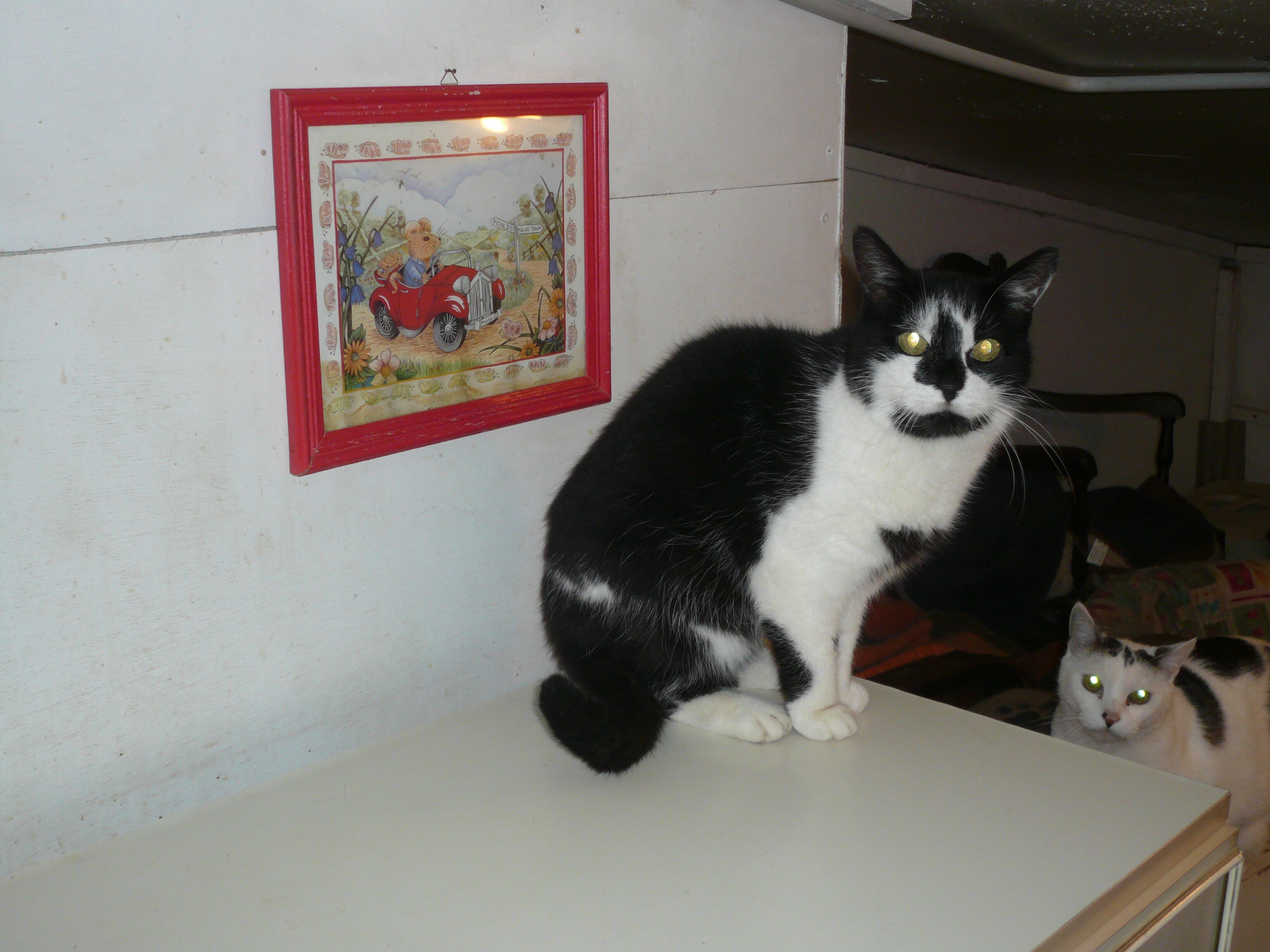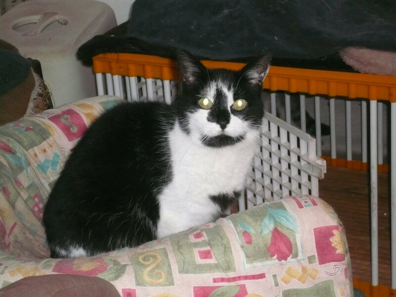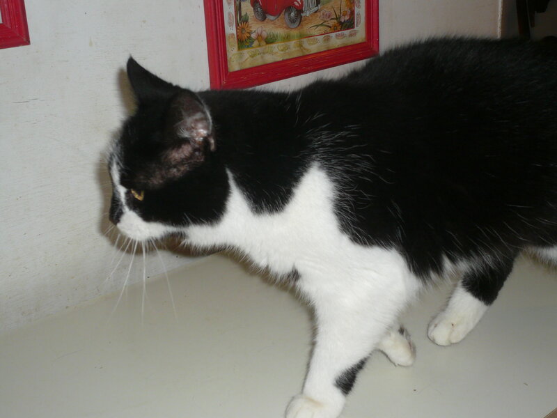 2. Le 10 juin 2010, vers 1 h du matin, j'avais entendu des cris au fond du jardin. J'avais pensé à un oiseau qui se faisait attaquer par un chat... je me suis précipitée, je ne voyais rien puis en levant la tête, j'ai aperçu "un petit truc" blanc qui balançait dans le vide. J'ai réussi à l'attraper, c'était un chaton noir et blanc qui s'agrippait à une petite branche de lierre... je revenais vers la maison quand les cris ont recommencé... là, ça a été plus compliqué parce que le second chaton était tout noir et je n'y voyais rien. En appelant et en essayant de toucher un peu partout, j'ai pu attraper le second chaton. J'ai attendu un peu, visiblement ils n'étaient que deux, en tout cas agrippés aux brindilles. Bien sûr, je n'étais pas équipée pour nourrir ces bébés, je leur avait mis un peu de pâtée mélangée à de l'eau et aussi un peu de lait avec de l'eau... pas fameux et ils étaient trop petits pour manger. Le lendemain matin direction vétérinaire et je suis revenue équipée de biberon, lait maternisé... A leur arrivée : ils avaient faim, mettaient leur nez dans la pâtée mais ne pouvaient pas manger : Je n'ai pas beaucoup de photos de leur arrivée en voici quelques unes environ trois semaines plus tard : Rubis : Saphir : Je les avais appelées Rubis et Saphir parce que j'avais récupéré au mois de mai une canichette de 13 ans squelettique et bourrée de tumeurs dont la maîtresse était décédée... je suis restée dans les pierres précieuses ou semi précieuses ! Saphir est décédée fin août l'an dernier et Rubis est partie hier. Dimanche et lundi, elle était normale et se promenait dans le jardin, elle avait mangé normalement. Lundi soir elle avait chipoté pour manger, elle léchait la pâtée et ne mangeait pas les parties formant un peu de boulettes. Je les avais écrasées, elle les avait mangées. Mardi j'ai pris rendez-vous chez le vétérinaire (rendez-vous mercredi). Le soir elle n'a pratiquement pas mangé, même en lui présentant à la cuillère. Je pensais qu'elle avait comme c'était le cas pour sa soeur angine, amygdalite, infection de la gorge, de la bouche parce qu'elle ne buvait pas spécialement beaucoup. Hier, prise de sang : la machine ne pouvait même plus mesurer l'urée (elle dépassait 2,71) elle avait effectivement une infection de la bouche, gorge. La mettre sous perfusion n'aurait fait que nettoyer les reins pendant quelques jours... peut-être pas. Je ne voulais pas lui imposer cette souffrance et la laisser en cage pendant quelques jours alors que ça n'aurait pas solutionné le problème. Le vétérinaire m'a bien dit que les reins ne fonctionnaient plus. Pour moi, il n'est question de faire des dialyses qui sont très difficiles à supporter. J'ai donc dû prendre cette décision que l'on appréhende tant. Je suis restée avec elle, bien sûr. Elle s'est endormie doucement, sans bouger et je l'ai caressée longtemps. J'espère qu'elle a retrouvé sa soeur, elles ne se quittaient jamais beaucoup. Voilà les dernières photos de Rubis :