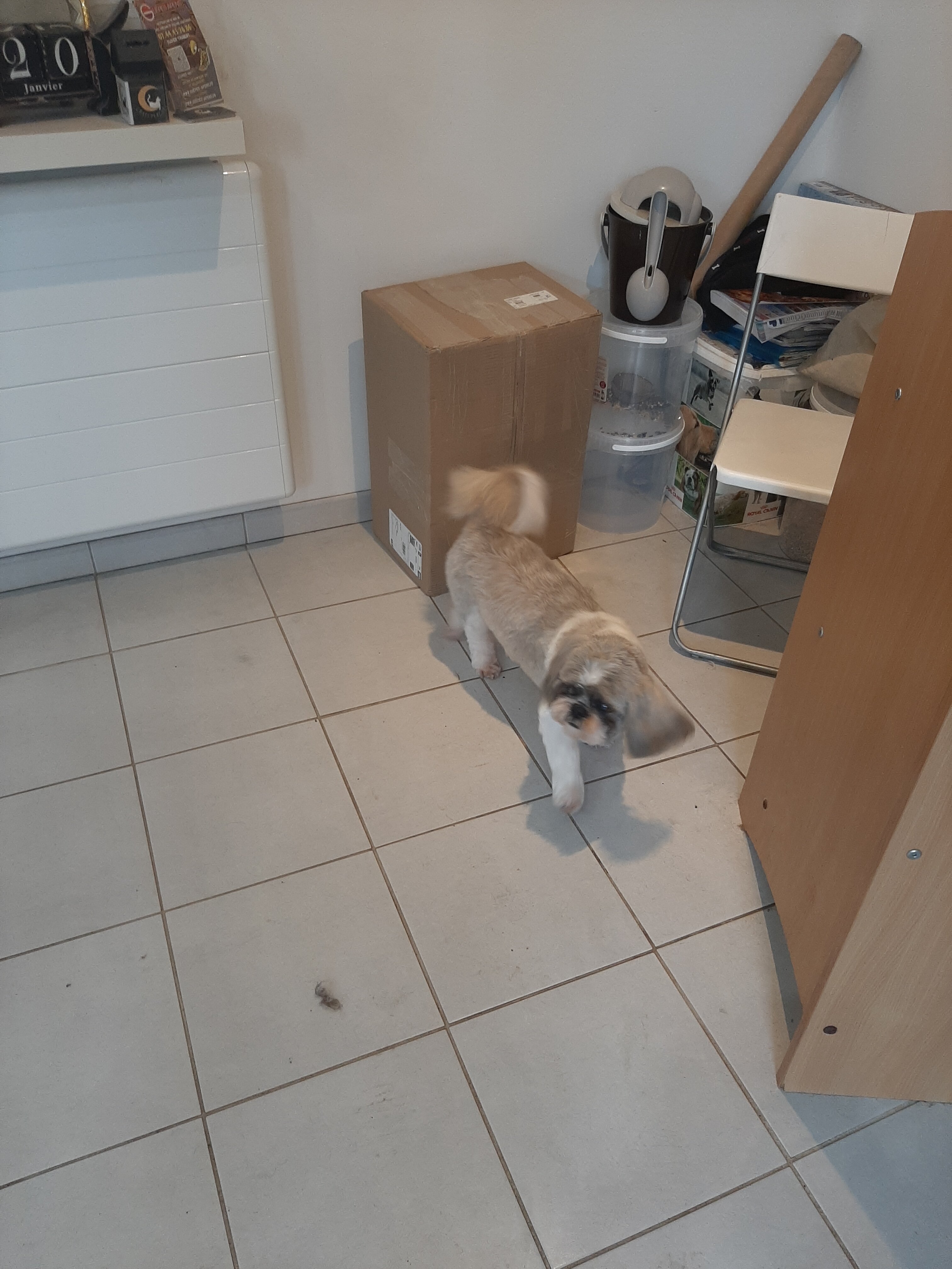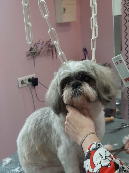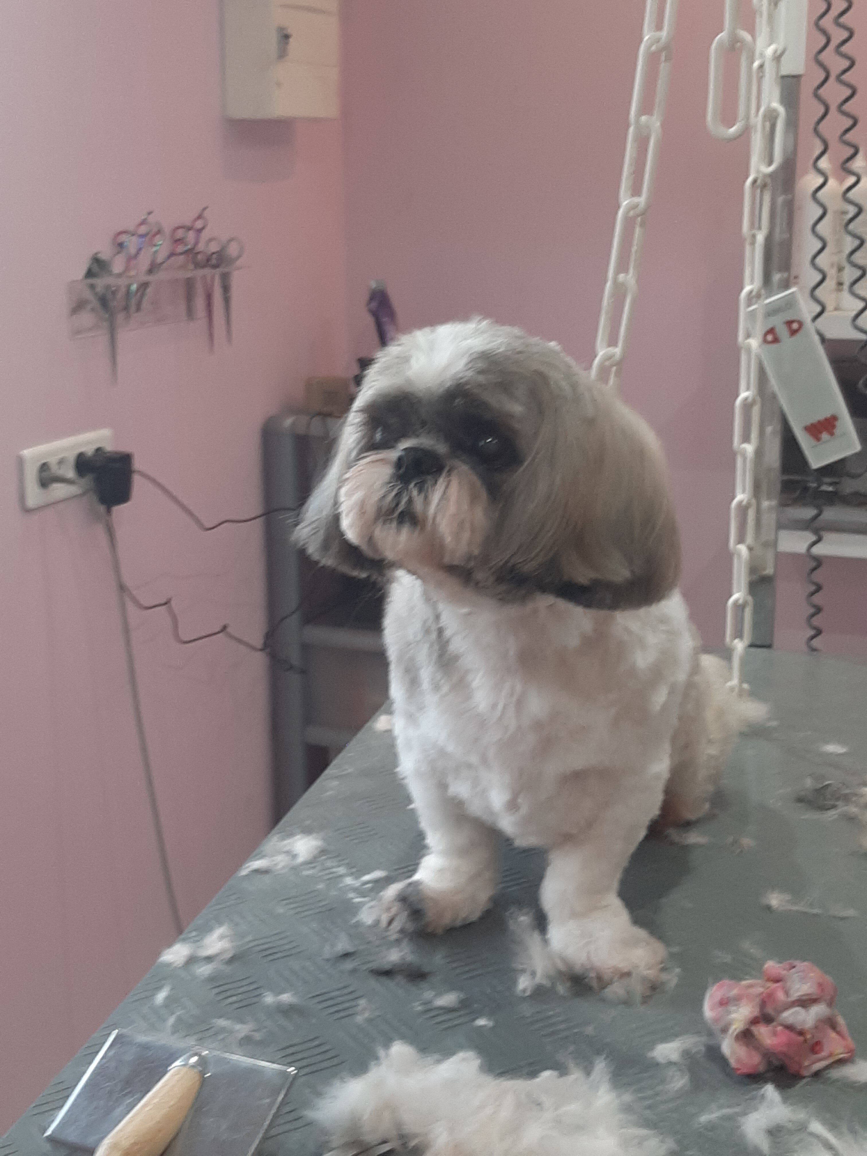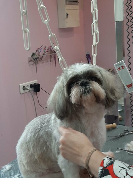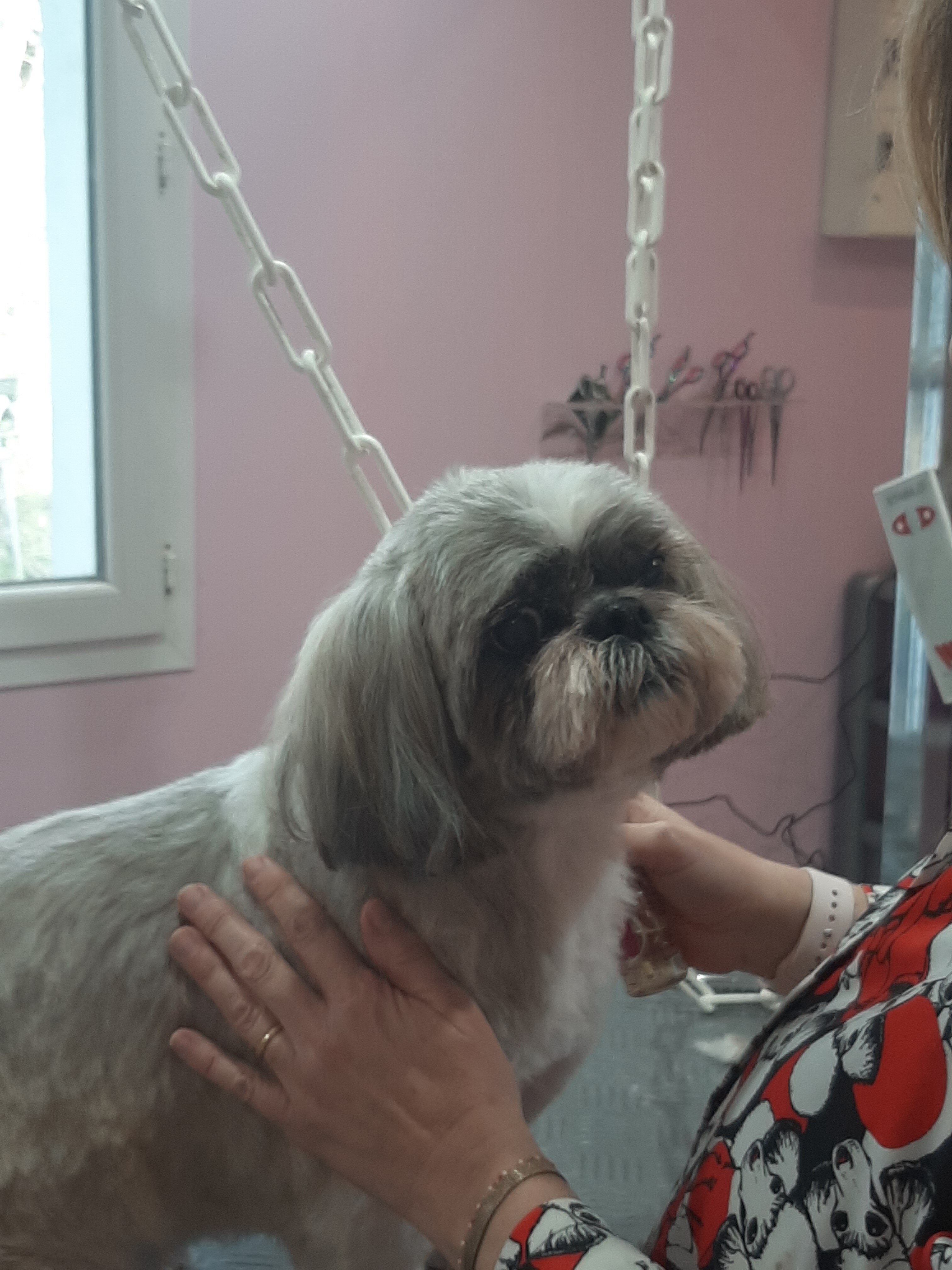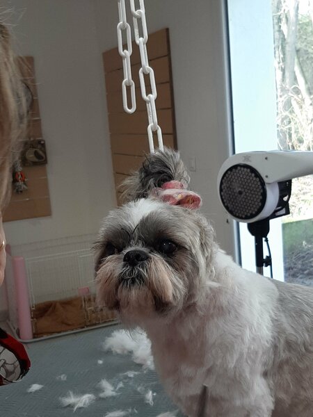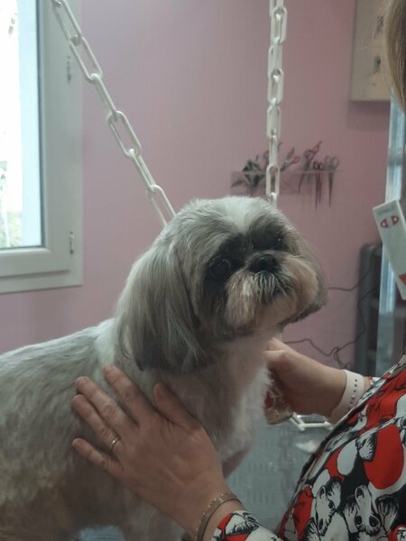 2. Toilettage hier chez sa copine Laetitia du sieur Rocky qui se laisse manipuler dans tous les sens sans hamacs quitter des yeux sa copine qui le fait beau