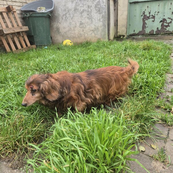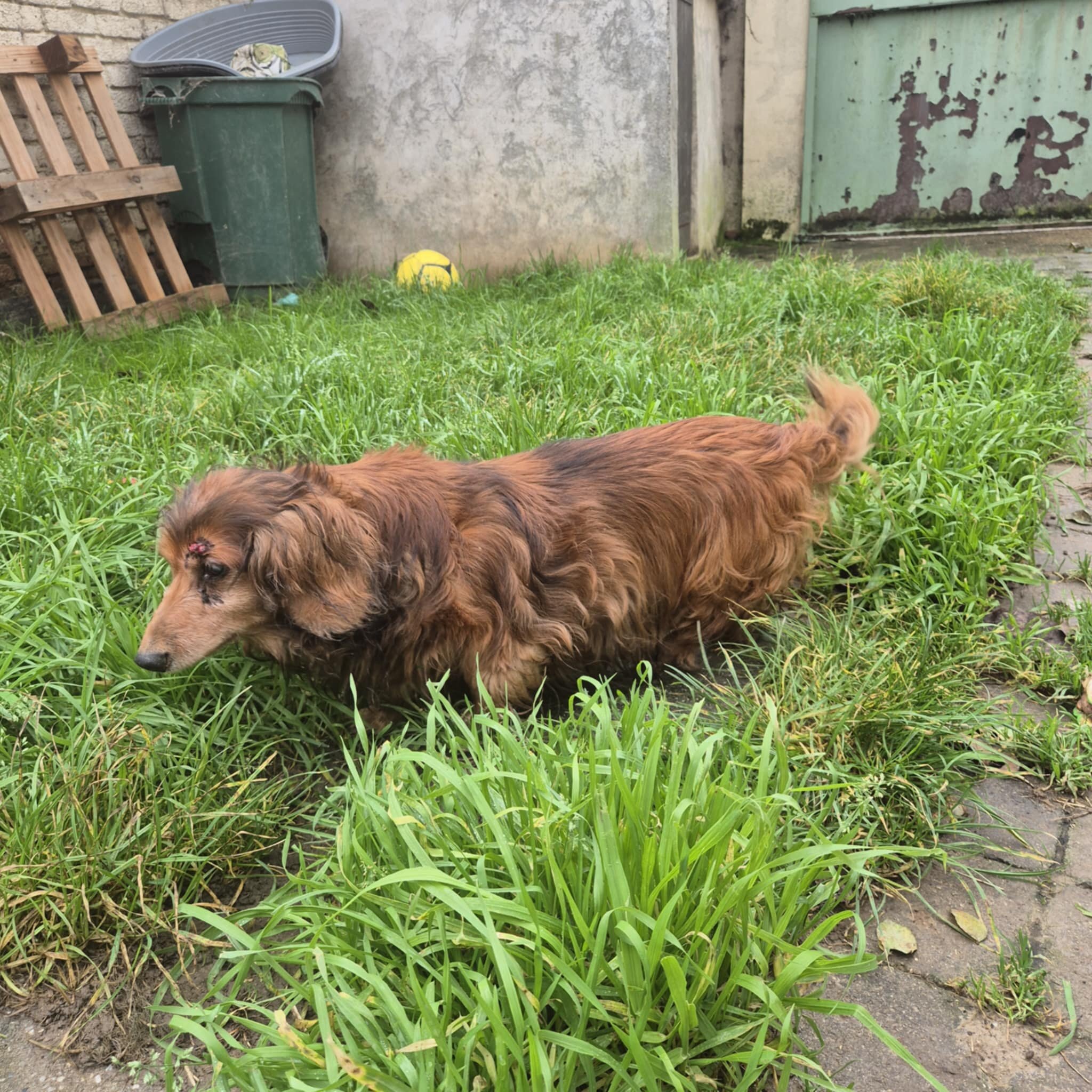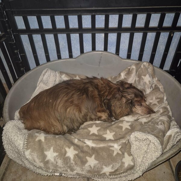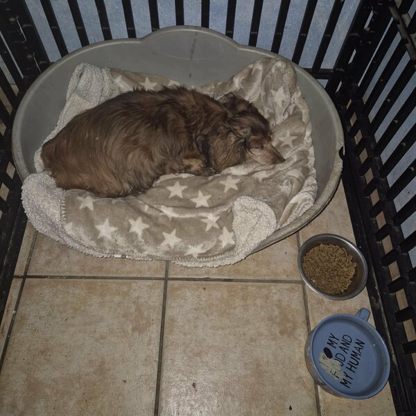 8. Junior était en liberté sur la banquette arrière de la voiture, à côté de la cage ou se trouvait la mamie teckel. Au départ je l'avais mis dans un des vari kennel mais dans la minute qui suivait il avait fait caca dedans et j'ai du tout nettoyer sur le parking du Mac Do (heureusement j'avais prévu cette possibilité et j'avais ce qu'il fallait). Je l'avais donc passé sur la banquette arrière et j'avais mis Jilou qui essayait de manger ma ceinture de sécurité arrière dans le vari kennel à nouveau propre. Junior se porte bien , c'est un gentil chien , un peu perdu (on le serait à moins) qui pour le moment suit Jilou comme son ombre. Lorsqu'il a vu que je faisais un câlin à son frère il a attendu et dès que je l'ai reposé il est venu timidement me voir au cas où j'aurai encore des câlins en stock. Il s'est laissé caresser et a bien apprécié mais il est plus timide et réservé que Jilou (en même temps vu les poils qu'il a devant les yeux il doit voir moins bien, je vais m'en occuper demain). Par contre il se montre dominant vis à vis de Jilou et le harcèle de façon pas toujours cool donc je pense que pour le bien de Jilou il faudra les faire adopter séparément. Le voici : Il sera toiletté lundi