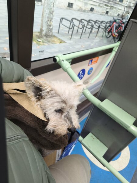 "Tatie Mayon m'a fait une drôle de blague ! D'abord elle m'a réveillé à 6h30 pour pipi et pti dej. Ensuite, elle a dit :"viens tu vas voir la capitale". On a pris la voiture et ensuite on est montés dans un truc qui roule plus grand que la voiture et qu'elle a appelé un train. Bien installé sur la tablette, j'ai pu continuer ma nuit Arrivés à Paris, on est descendu de la garre du Nord à République à pattes ! Heureusement ça descendait vraiment. Et puis il y avait des trucs rigolos qui m'ont bein plu : des pigeons. On est entrés dans un bistrot, où j'ai eu droit à une gamelle d'eau que j'aurais pu prendre un bain dedans, mais c'était gentil de penser à moi. Pendenat que Tatie parlait avec son ami du Niger, j'ai pu refaire un pti somme. C'est qu'après, il a fallu retourner à la gre. Mais pas question de refaire tout le trajet à pattes. On a opté pour le bus. J'ai pris place dans mon sac de transport et on a attendu à l'arrêt mais pas longtemps. Ensuite on s'est bien installé et j'ai pu regarder la fameuse "capitale". - today