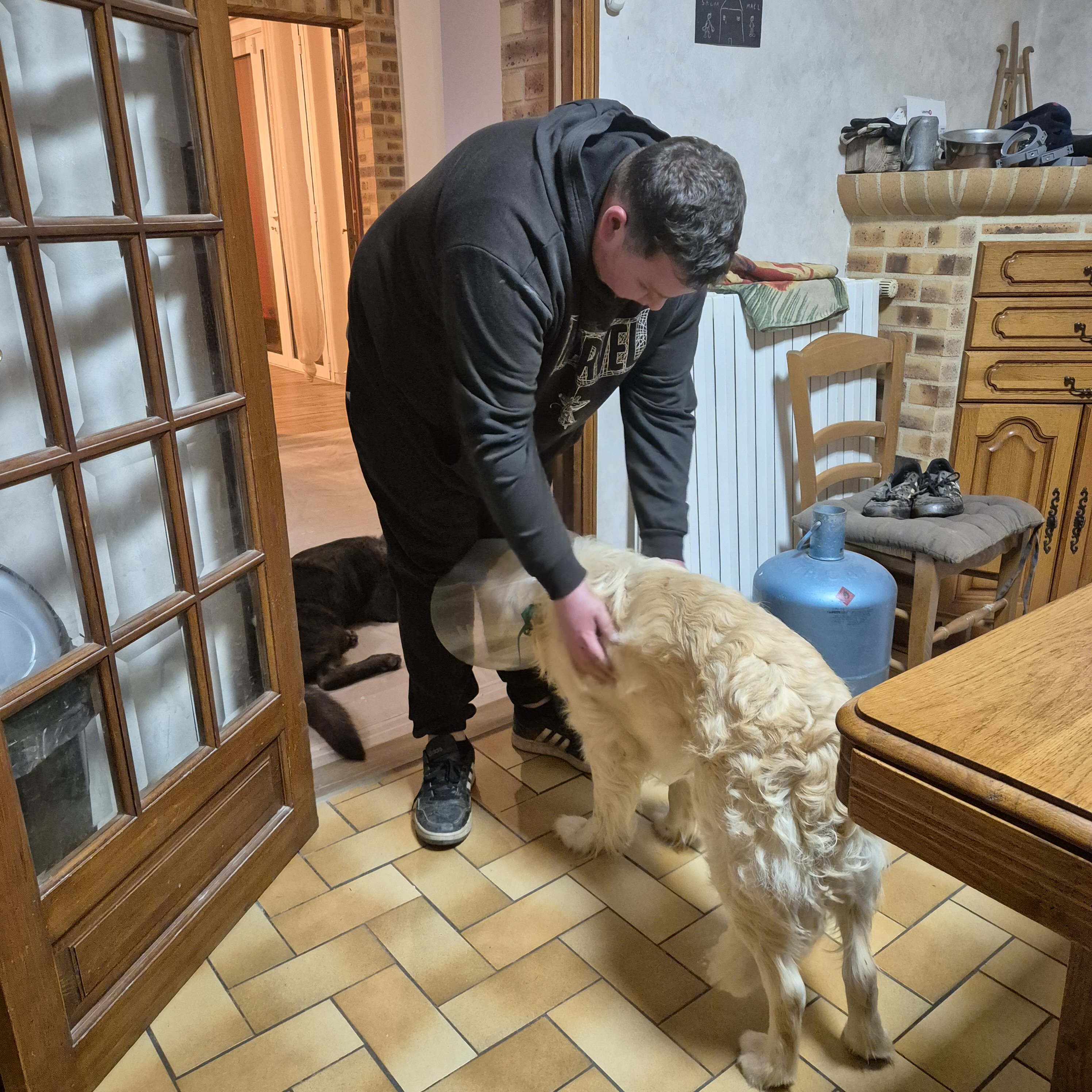 La castration de Rooki c est tres bien passée. La prise de sang est bonne. Il est en sous poids 28,6 kg et démusclé. Il a un traitement pour une otite bilatérale et une conjonctivite. Il a eu un comprimé anti puce et un vermifuge a prendre dans 3 jours. Dylan le nouveau papa de Rooki qui va vivre dans les Vosges a fait 5 heures de routes pour venir le chercher hier. Il a dormi a Sauqueuse ou nous avons offert l hospitalité et il est reparti ce matin a 6h30 avec Rooki. Voici les photos prises hier au soir puis a son arrivée dans son nouveau sweet home où il était très attendu.22 points