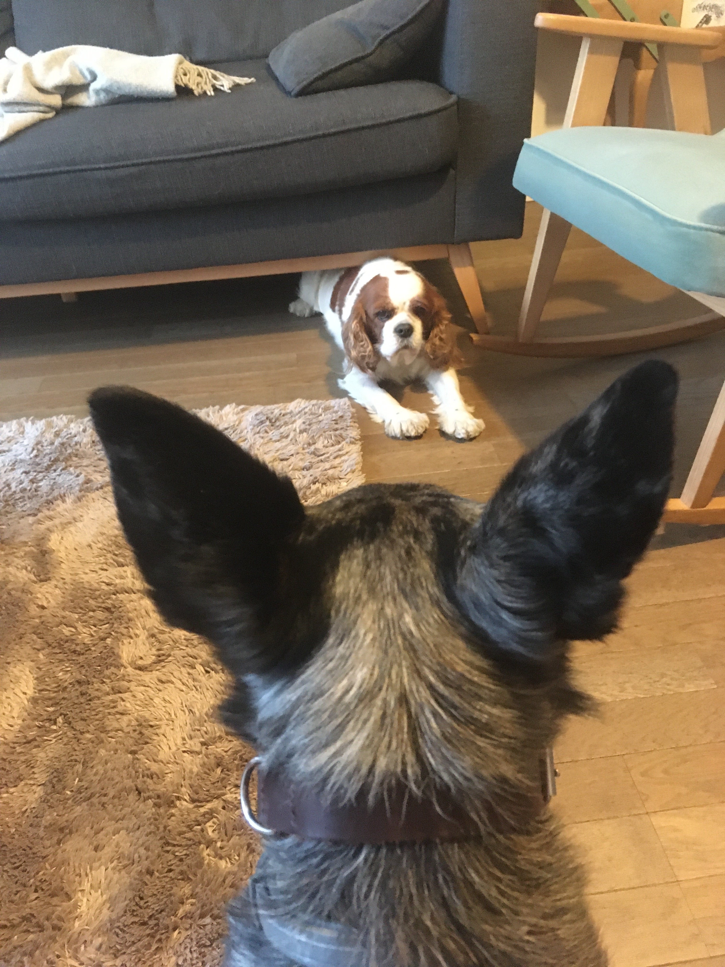 De jolies photos des deux loulous qui ont l'air bien calmes tous les deux. Le panier est très beau et doit être confortable... le lit ce n'est pas mal non plus ! peu à peu les deux chiens vont se rapprocher, tout se passe en douceur donc c'est très positif. Un bouvier australien garde le troupeau et une Kitty garde la nourriture : chacun son truc.1 point