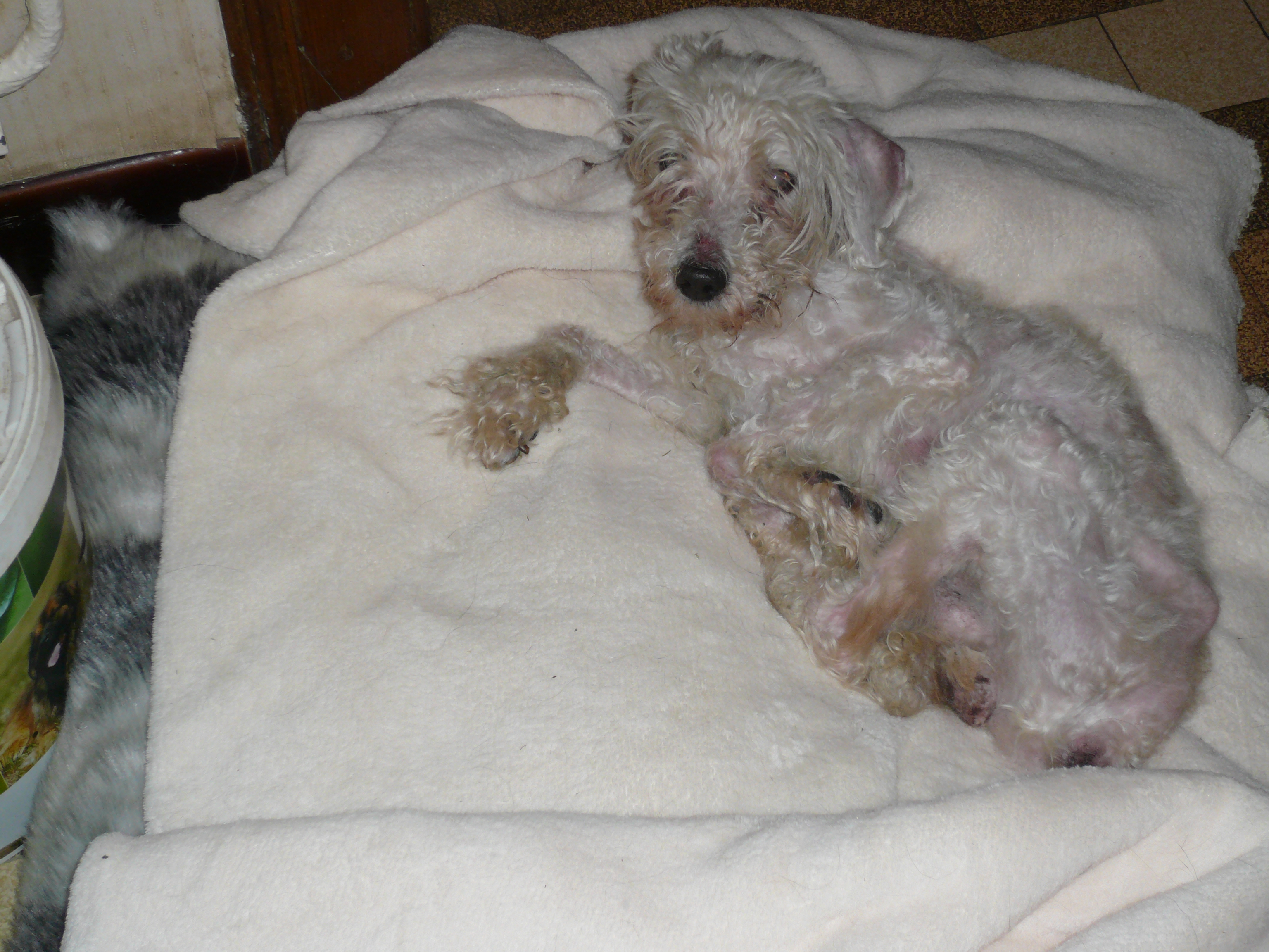 Le petit Ubert s'intègre bien. Je le trouve un peu plus vif, c'est normal le pauvre commençait à s'habituer chez ses sauveurs et je suis venue l'enlever... il y a de quoi se poser des questions. Il sait déjà bien entrer et sortir, il me suit dans la maison et dans le jardin. Avec les autres, pas de problème (bien sûr je ne le laisse pas sans surveillance avec Mirza mais tout se passe bien). Aujourd'hui, j'ai augmenté un peu les rations et il a tout mangé rapidement. Ce soir, il avait terminé son assiette, je lui ai ajouté un peu de pâtée hypoallergénique qu'il a engloutie. Il digère sans problème. Je ne veux pas donner trop parce que les chiens qui ont manqué de nourriture peuvent être boulimiques. Voici plus particulièrement pour ses marraines quelques photos du jour : Il adore aller dans le jardin et s'y promener longtemps mais j'ai peur qu'il se fatigue trop je lui fais faire des sorties plus courtes assez souvent. Aujourd'hui, il faisait beau mais le vent était froid. Je lui ai mis un manteau et ça n'a pas été trop difficile parce qu'il n'est pas nécessaire de le passer par la tête : Avec Elvis : Avec Mirza et Foxy : Cette après-midi pendant la sieste lorsque je venais le chercher pour son repas de l'après-midi :4 points