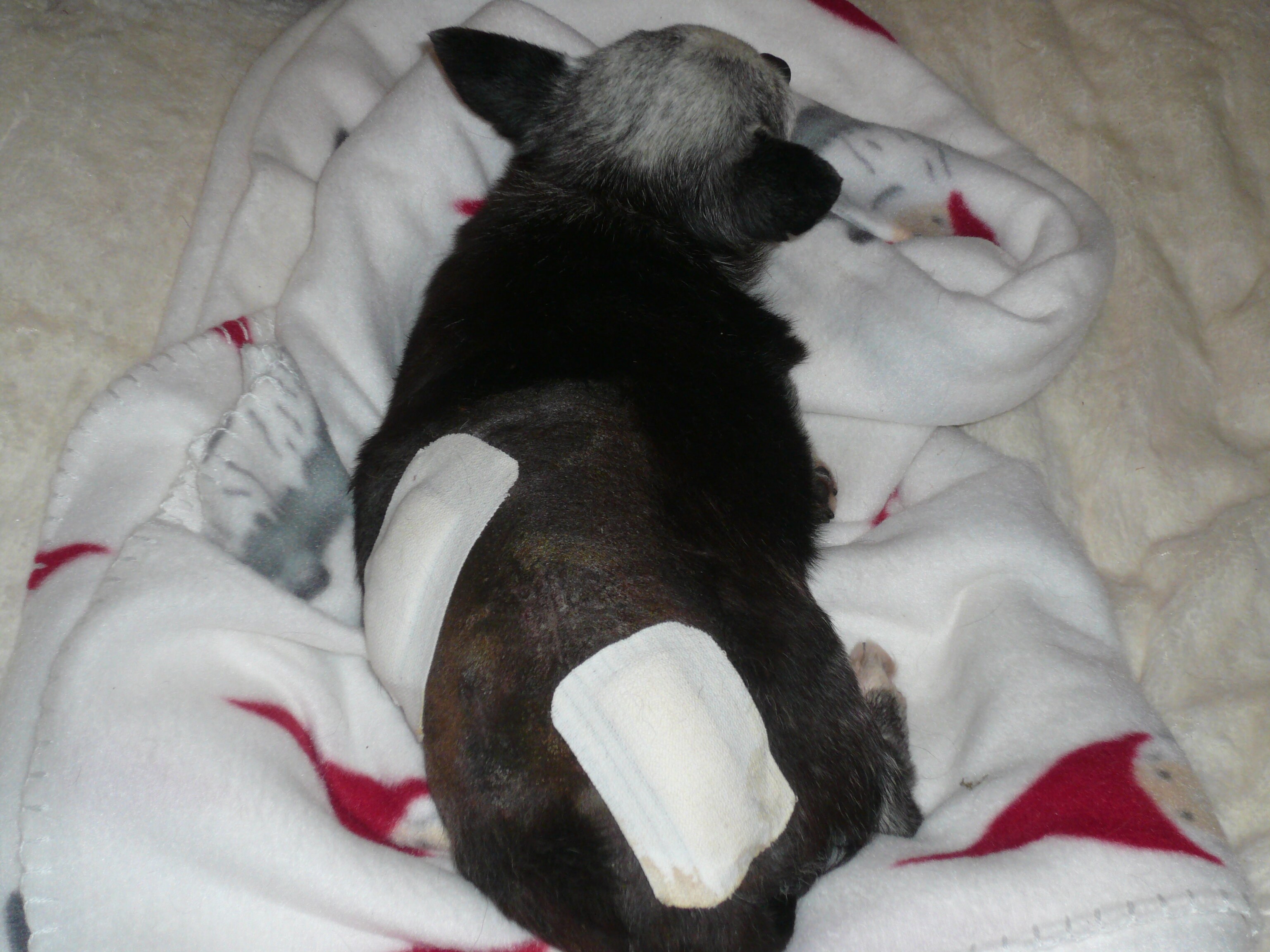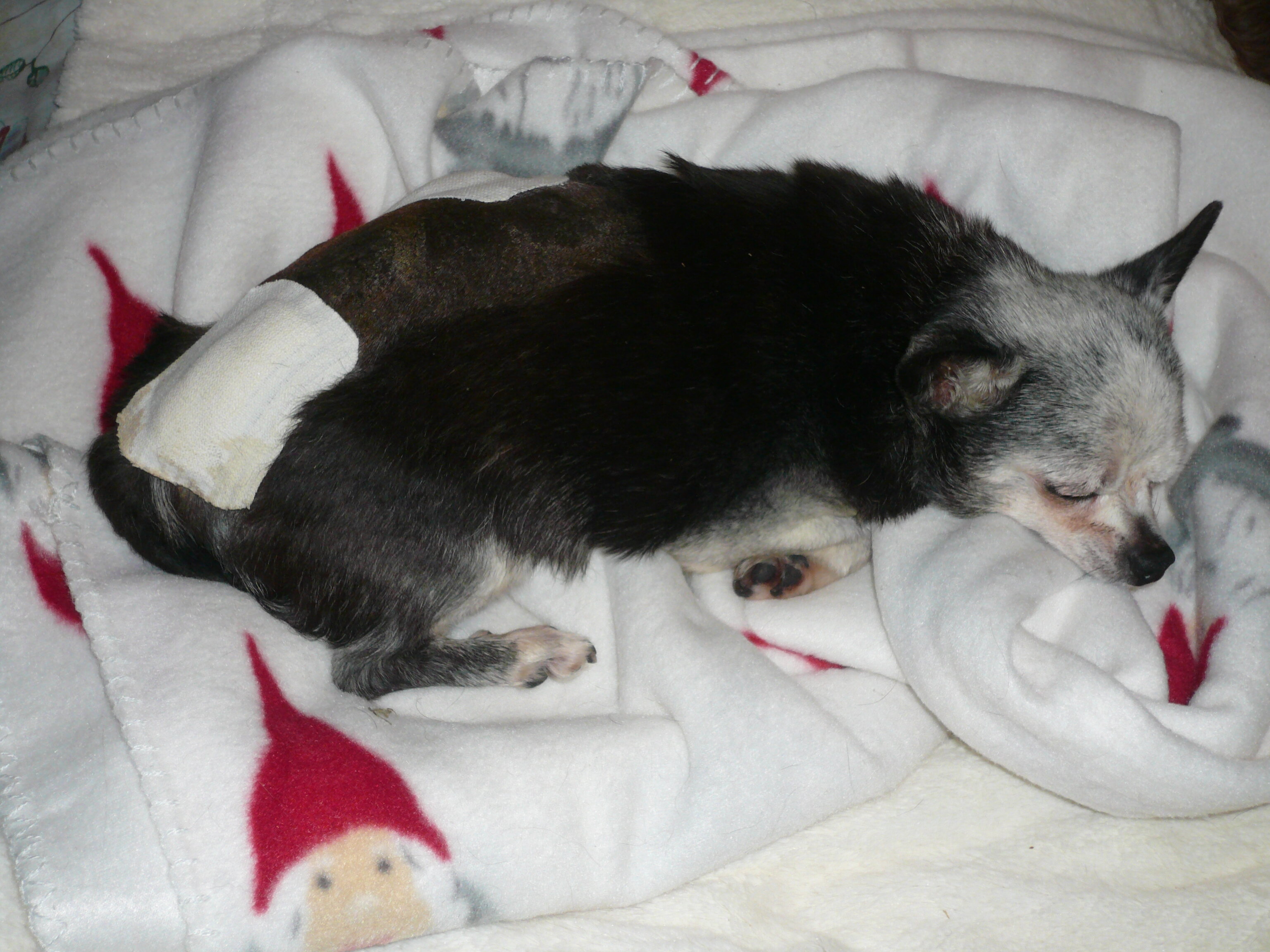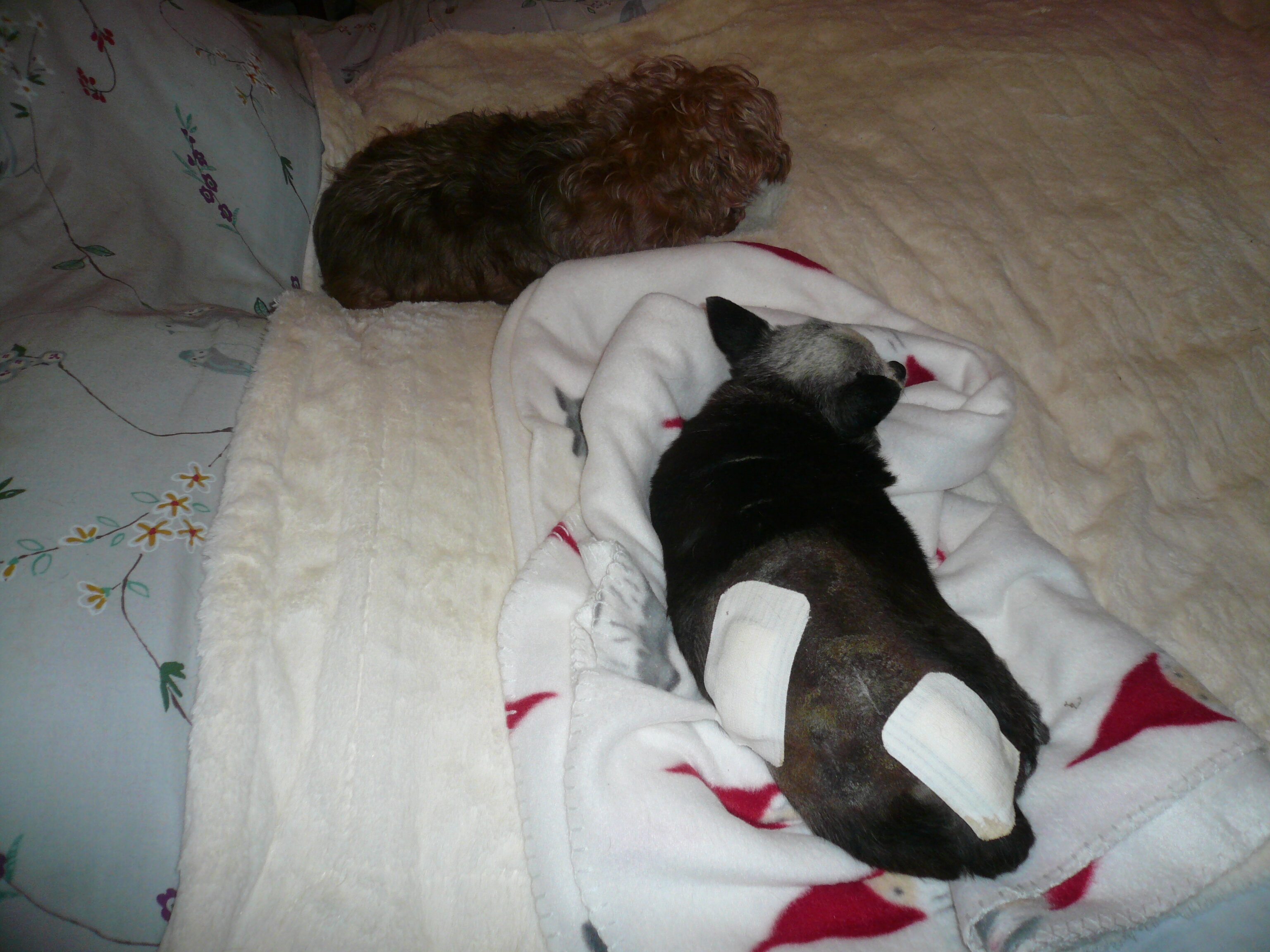 La nuit s'est bien passée pour tout le monde. Elvis s'est bien reposé et Titi Gucci aussi, il est en forme. Par contre ma petite Gigi est chez la toiletteuse elle tremblait comme une feuille quand je l'ai laissée. Le Sieur Jason n'a eu qu'à moitié satisfaction hier soir : il a mangé du riz (miam miam !) mais avec du blanc de poulet parce que j'ai acheté un filet de dinde qui fait 2,5 Kg mais je n'ai pas eu le temps de cuire hier soir. Ma prestation sera plus satisfaisante aujourd'hui. Voilà mon petit Gucci au dodo hier ! les pansements seront enlevés dans environ 5 jours. Sous le menton il n'y a qu'un fil. Avec Gigi, bien sûr : -