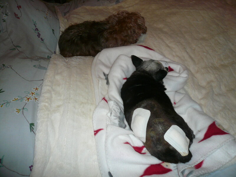 Tout le monde est de retour. Le petit Gucci est très en forme, il trotte comme si de rien n'était mais je l'ai mis au calme et au chaud. Quelle joie pour lui de retrouver sa Gigi et sa maison ! il aura droit à un repas léger vers 21 h. Comme en juin, ils ont profité de l'anesthésie pour le détartrer. Il a de nouveau perdu une petite dent. J'espère que les nodules ne reviendront plus. Elvis est de retour aussi, il est tout beau mais le toilettage est très fatigant pour lui : il ne peut plus s'asseoir et n'a plus beaucoup de force dans les pattes. La toiletteuse le laisse se reposer quand elle voit qu'il est trop fatigué. Ici, il ne s'assied plus il marcherait jusqu'à épuisement, je le mets dans son panier et il dort. L'âge est là : il a eu 17 ans en juin. Demain, à 8 h 30, c'est au tour de Gigi d'aller au toilettage. Ensuite ce sera plus calme, juste le retrait des pansements du Titi et vérification de la cicatrisation. -