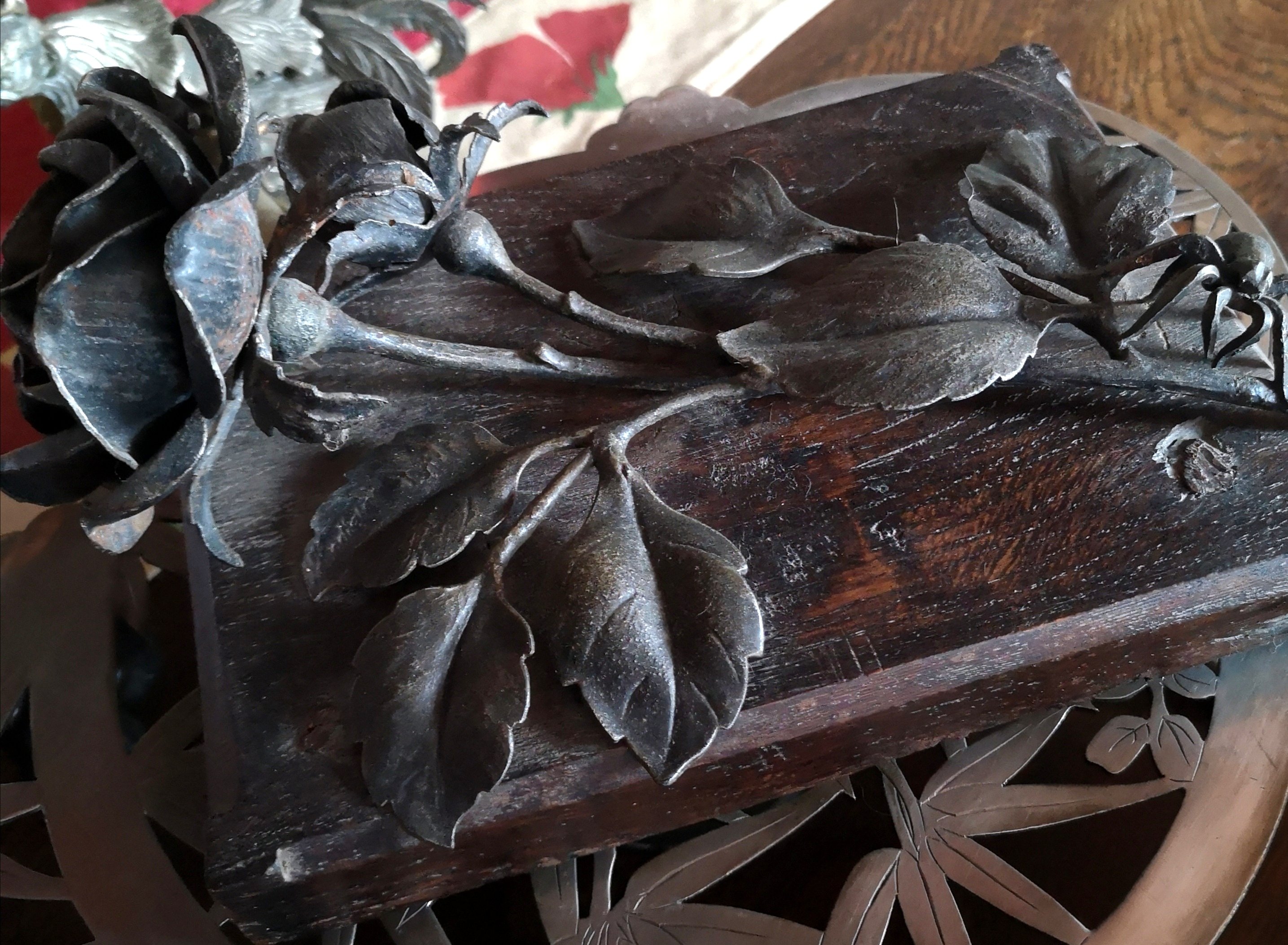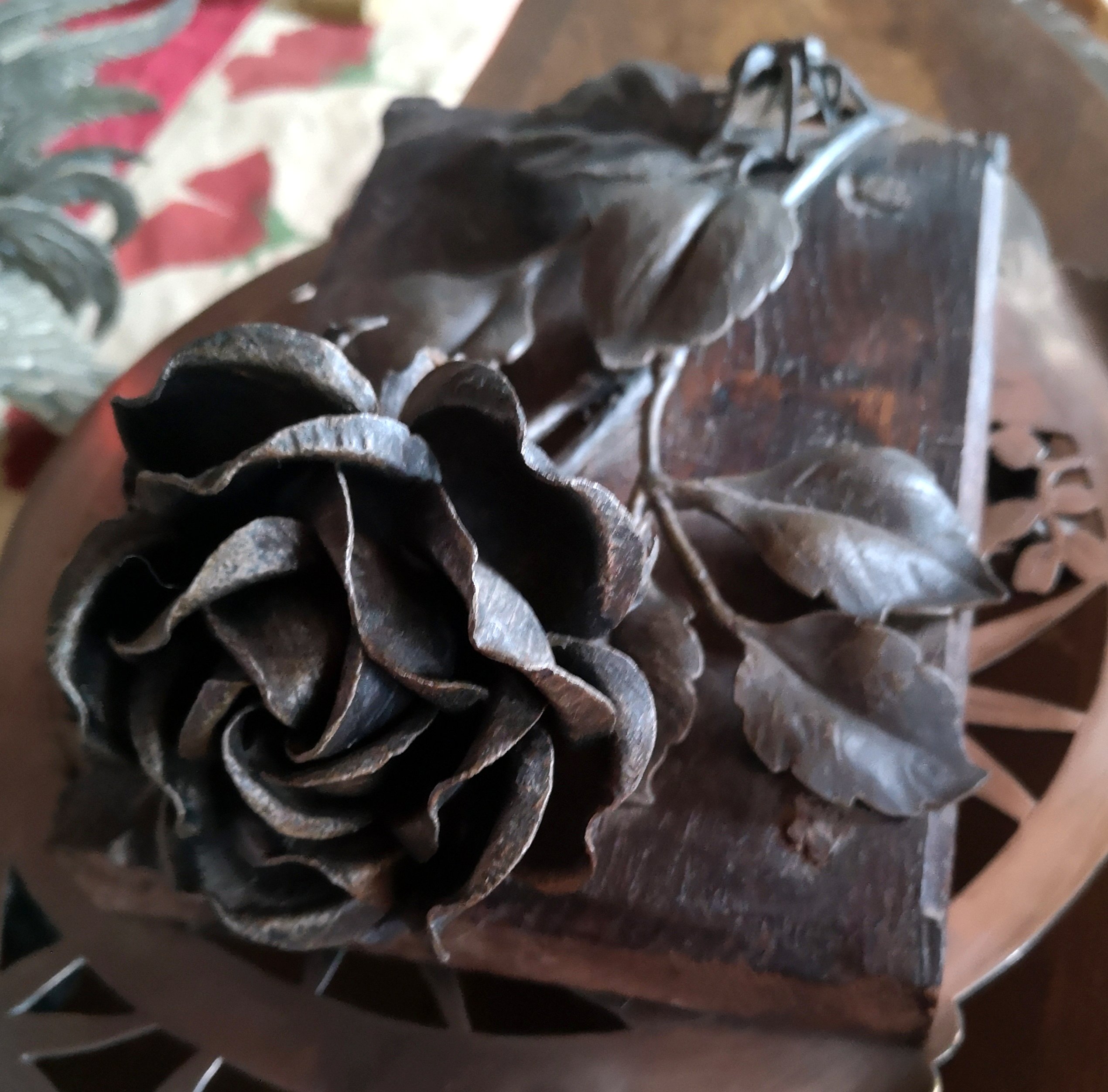 Posté(e) le 21 avril 20206 a Comme déjà dit, mon père était ferronier d'art, restaurateur pour les monuments historiques... quand il retravaillait une grille, un tabernacle (il travaillait aussi le cuivre), et autres travaux, il faisait souvent une sorte de prototype pour "voir" et j'avais l'habitude de garder les prototypes que je plaçais sur des cadres en bois... je ne vais pas vous infligez tout ce que j'ai qui pourrait vous rappeler des grilles et autres que vous aurez pu voir dans certains monuments ouverts à la visite ! mais je vous montre juste ce qu'il m'a donné pour fêter mon BAC... il m'avait acheté des roses et il y avait un paquet avec une rose... en fer forgé, le petit mot d'accompagnement me disant que si les fleurs se faneraient, au moins celle-ci, je pourrai la garder plus longtemps ! Comme je n'aime pas trop les araignées, il a fallu qu'il m'en rajoute une dans la composition ! il était très taquin !!
