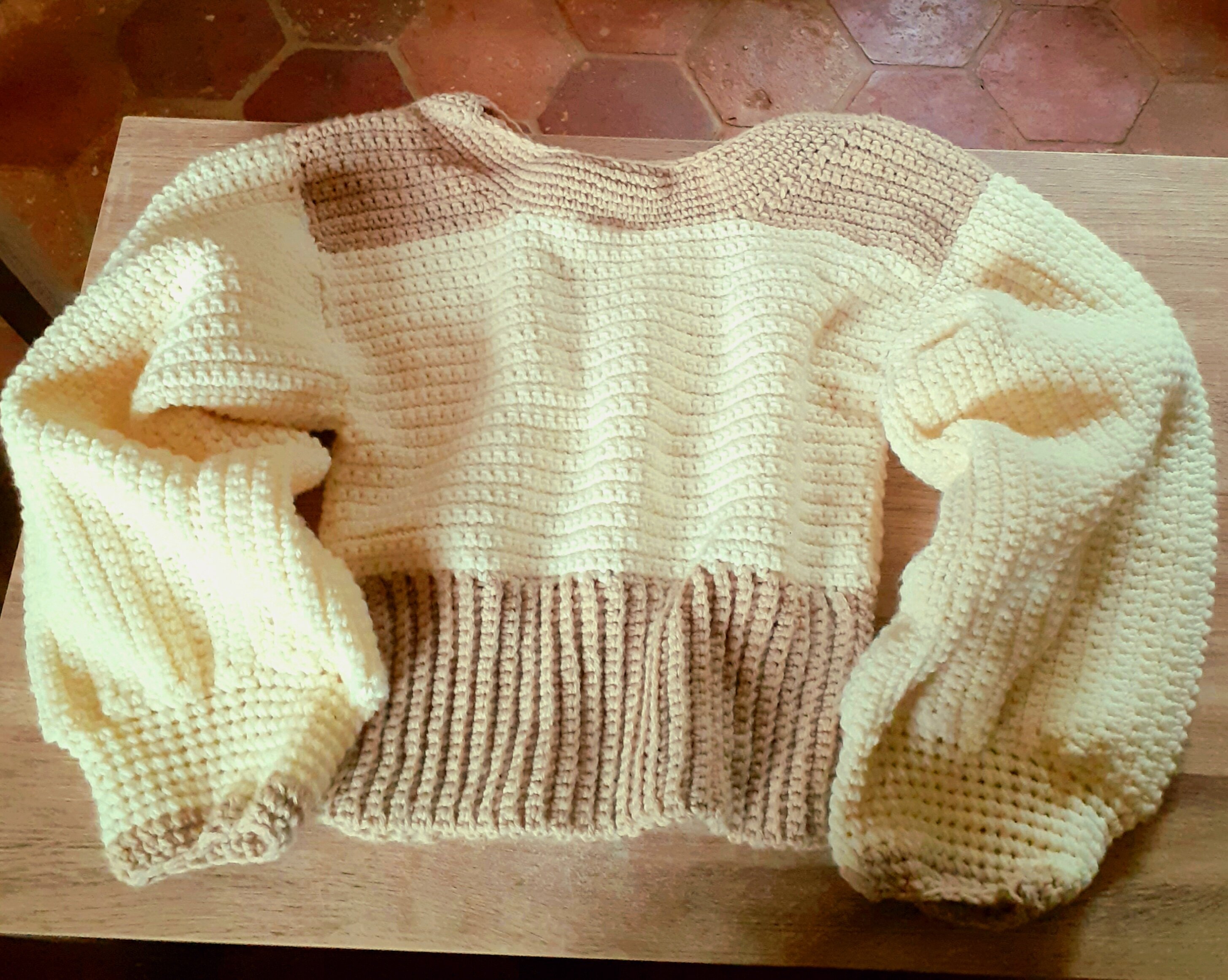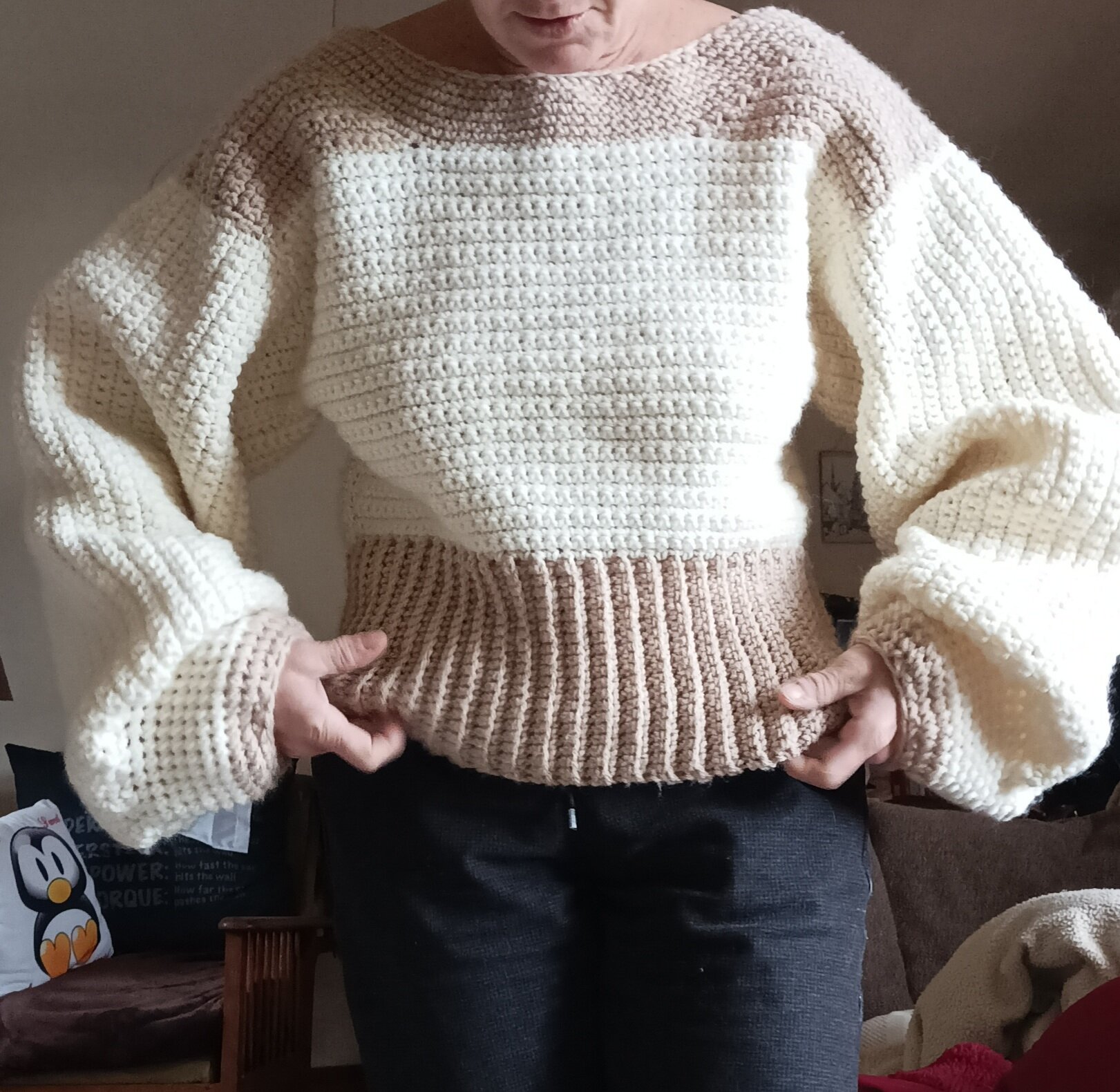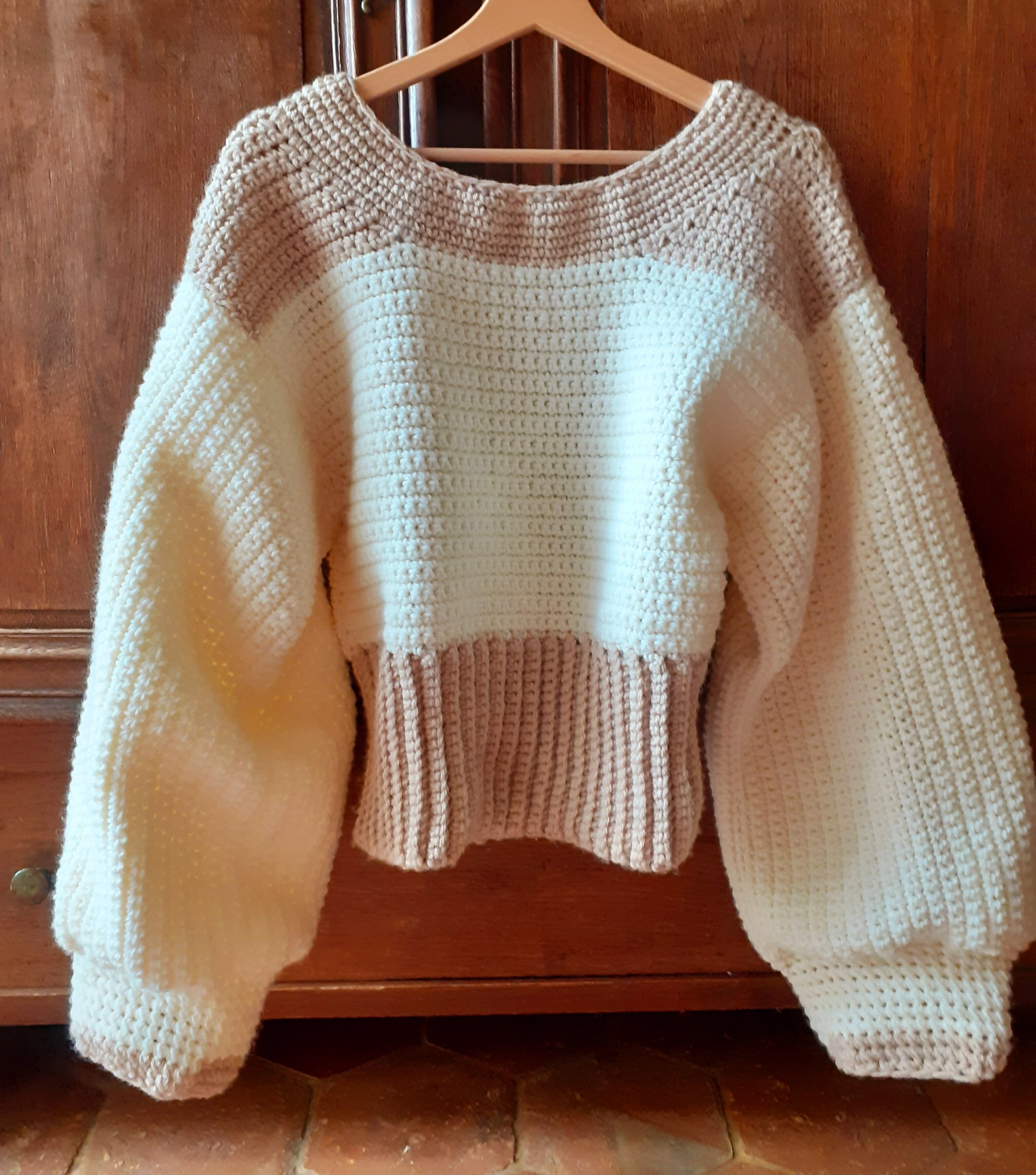 Posté(e) le 4 novembre 20232 a Il me restait de la laine bien chaude de ma couverture alors j ai sorti mes crochets et je me suis fait un gros pull avec des manches ballons. Je viens juste de le terminer (5 jours pour la réalisation)