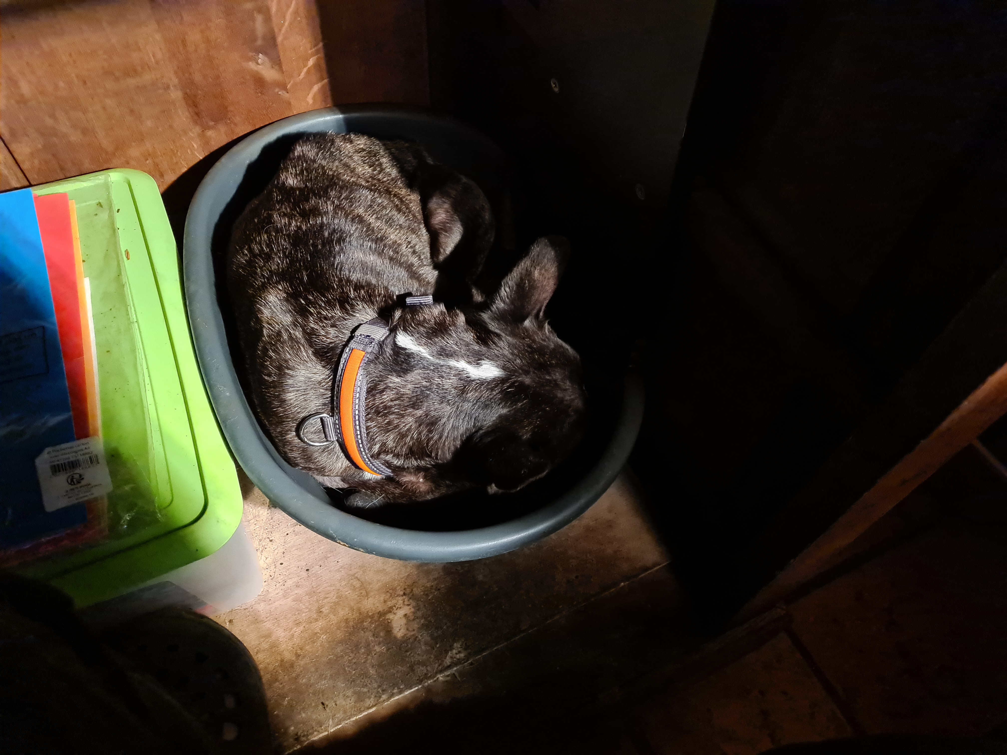 Posté(e) le 10 décembre 20205 a le coeur a ses raisons que la raison ne connait pas ! cet adage est exactement celui qui convient ! Ca fait un moment que la "vilaine" Sandrine m'envoie les photos de Penny Lane pour me taquiner car il est vrai qu'un bouli était un de mes rêves ! mon père avait le même rêve mais à son époque, on n'en trouvait pas dans les refuges et comme ma mère nous ramenait les chiens de fourrière non placés on a toujours eu beaucoup de "croisés" mais rien de bouledogue ou ressemblant ! Quand j'ai eu ma maison, j'ai questionné les refuges de Lille et Roubaix et bien sûr, pas de cette race... j'ai donc pris au fil du temps des chiens de races (ou très croisés) différents, en les trouvant d'ailleurs extraordinaires ! J'avais pris en accueil ponctuel Garou et Gaufrette pour ceux qui s'en souviennent mais ils ont été adoptés deux fois rapidement... et voilà pourquoi je regardais avec envie Penny Lane mais en disant bien à Sandrine que j'étais trop vieille pour prendre un jeune chien ! Et toc ! voilà Simon ! j'ai cherché une adoptante mais celle trouvée a un chat et l'ami Simon ne les aime pas ! pendant ce temps mes amis (faux frères ou soeurs !) me téléphonaient pour me dire qu'ils ne comprenaient pas et Simon y a mis beaucoup du sien en me suivant partout, y compris sur mon lit pendant que je dormais ! Donc, voilà ! j'ai craqué ! il a bientôt 13 ans ce qui pour un bouledogue est bien âgé mais bon... le temps qu'on passera ensemble sera plein d'amour, même si c'est court ! on verra ! Là je suis assise à mon bureau, et il a voulu s'y installer (mon bureau est un ancien comptoir de vente sans fond... j'y avais rangé des papiers et des bouquins ! il a tellement insisté que j'ai enlevé tout ce que j'ai pu pour y glisser un panier et il est donc "sur mes pieds" dès que je m'y asseois ! désolée de la qualité de la photo mais je n'ai pas de recul pour mieux cadrer et c'est relativement sombre...